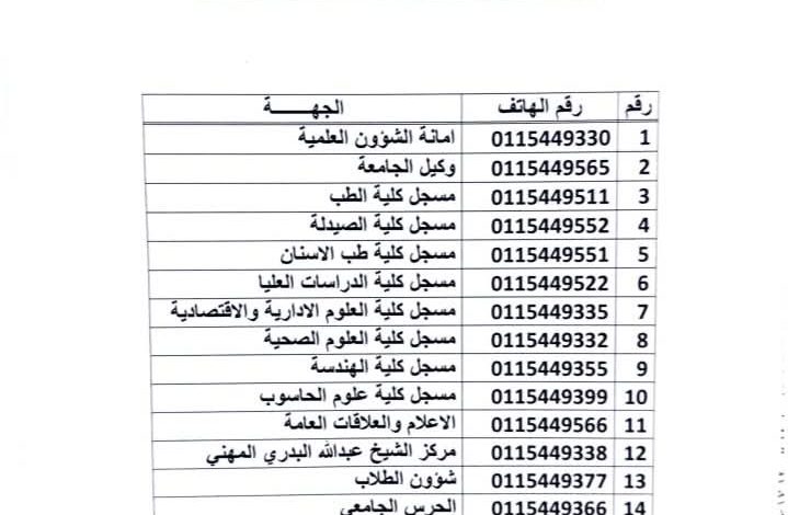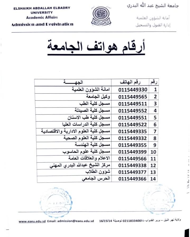 Contact numbers for the university